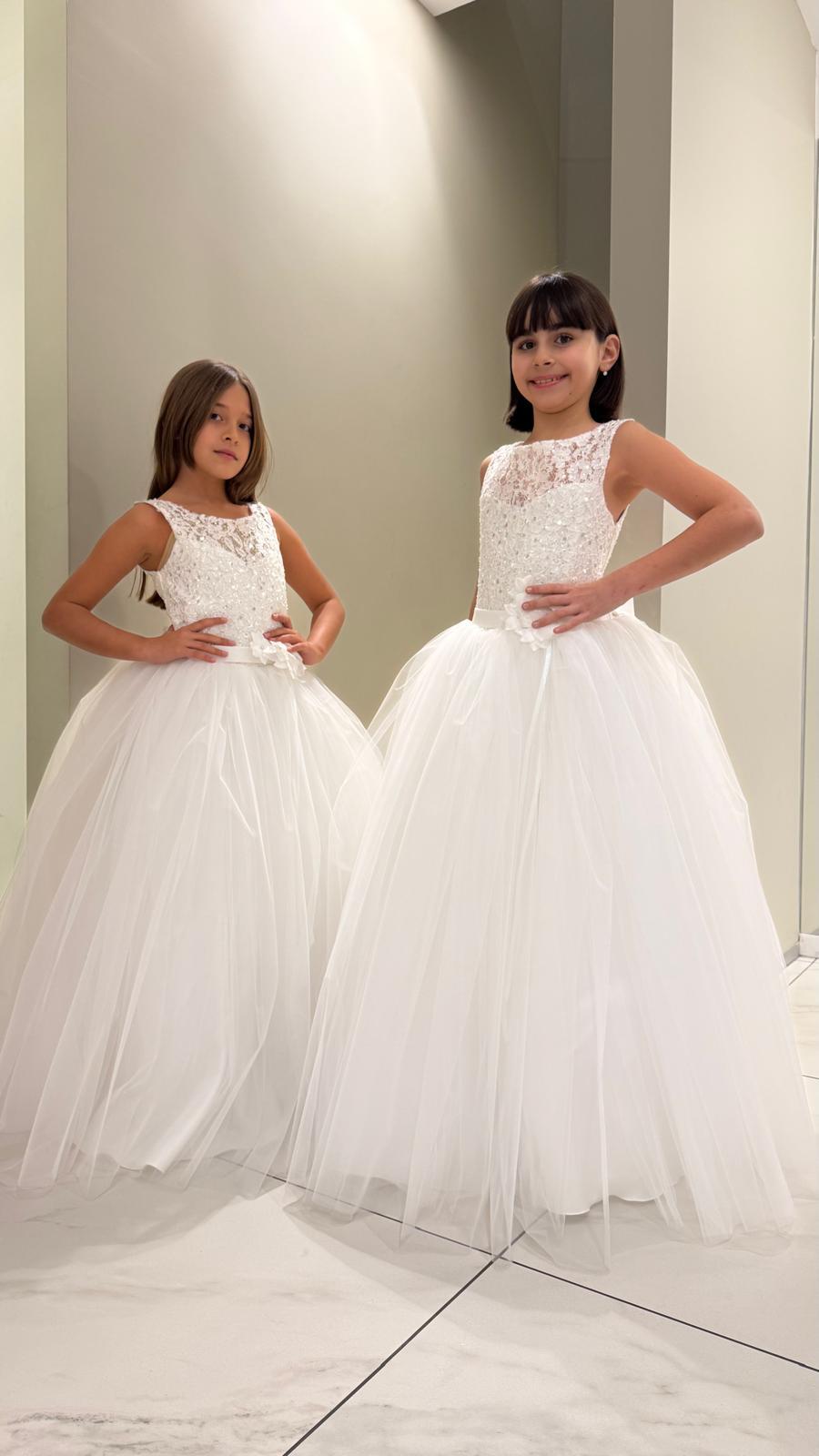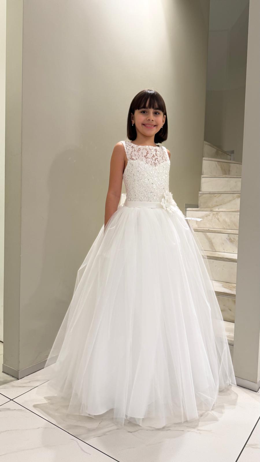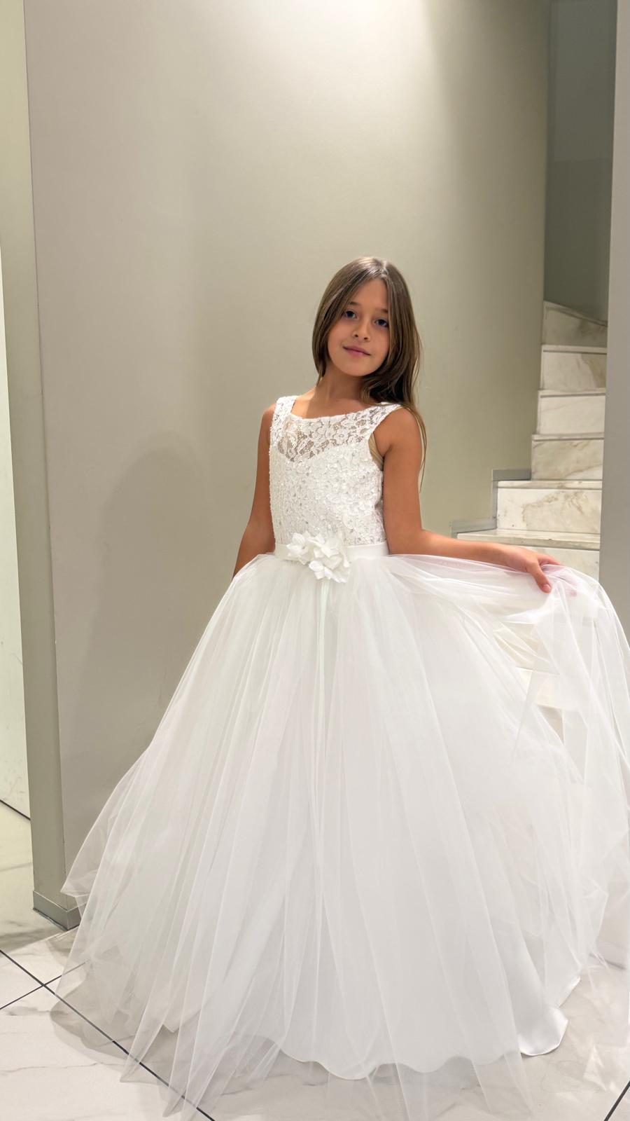 Abito in tulle, con corpino in pizzo ricamato, color bianco. Made in Italy, rifinito nei minimi dettagli.
