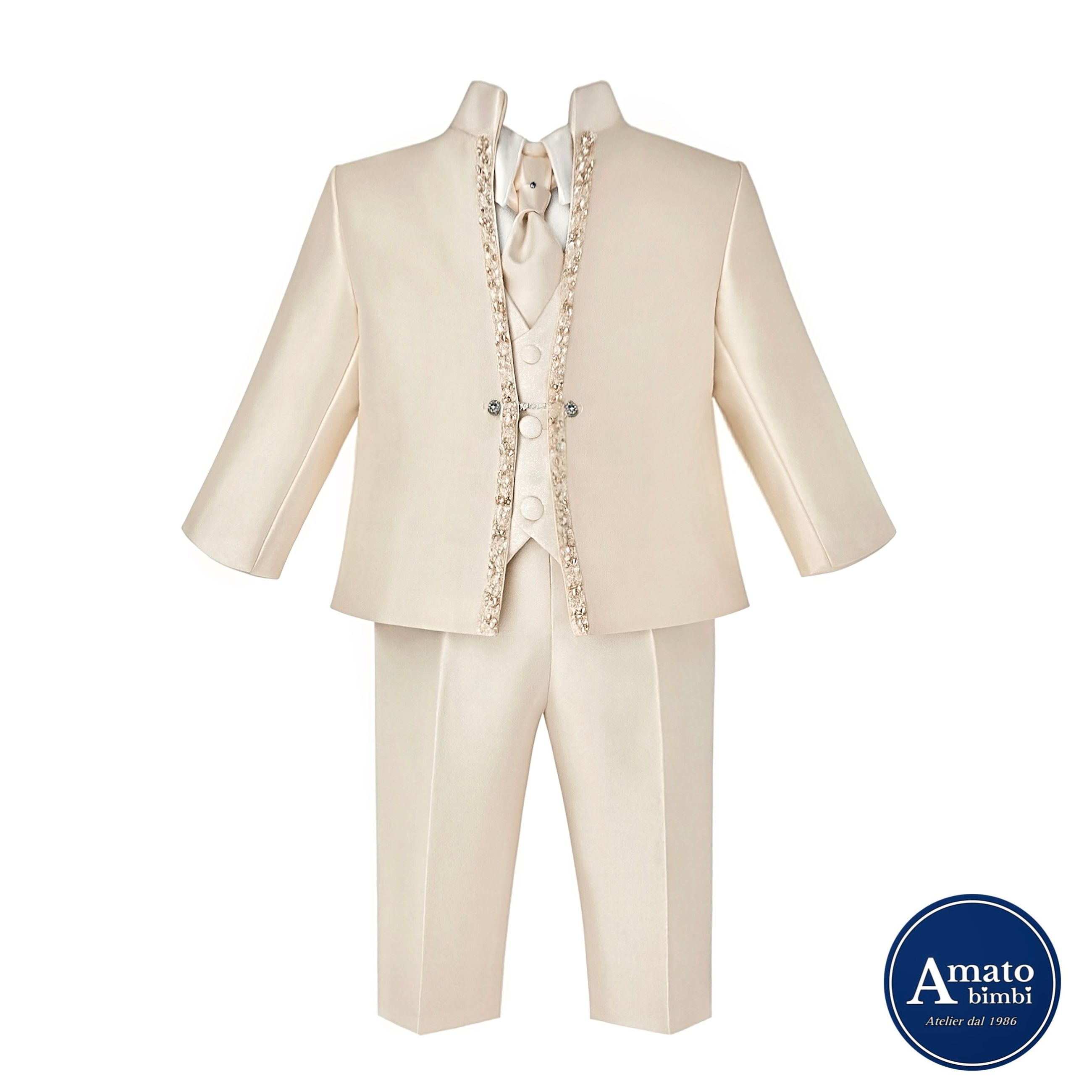 Completo 5 pezzi, giacca e pantalone in mikado, gilet in tessuto brillantinato, color oro. Made in Italy, rifinito nei minimi dettagli.