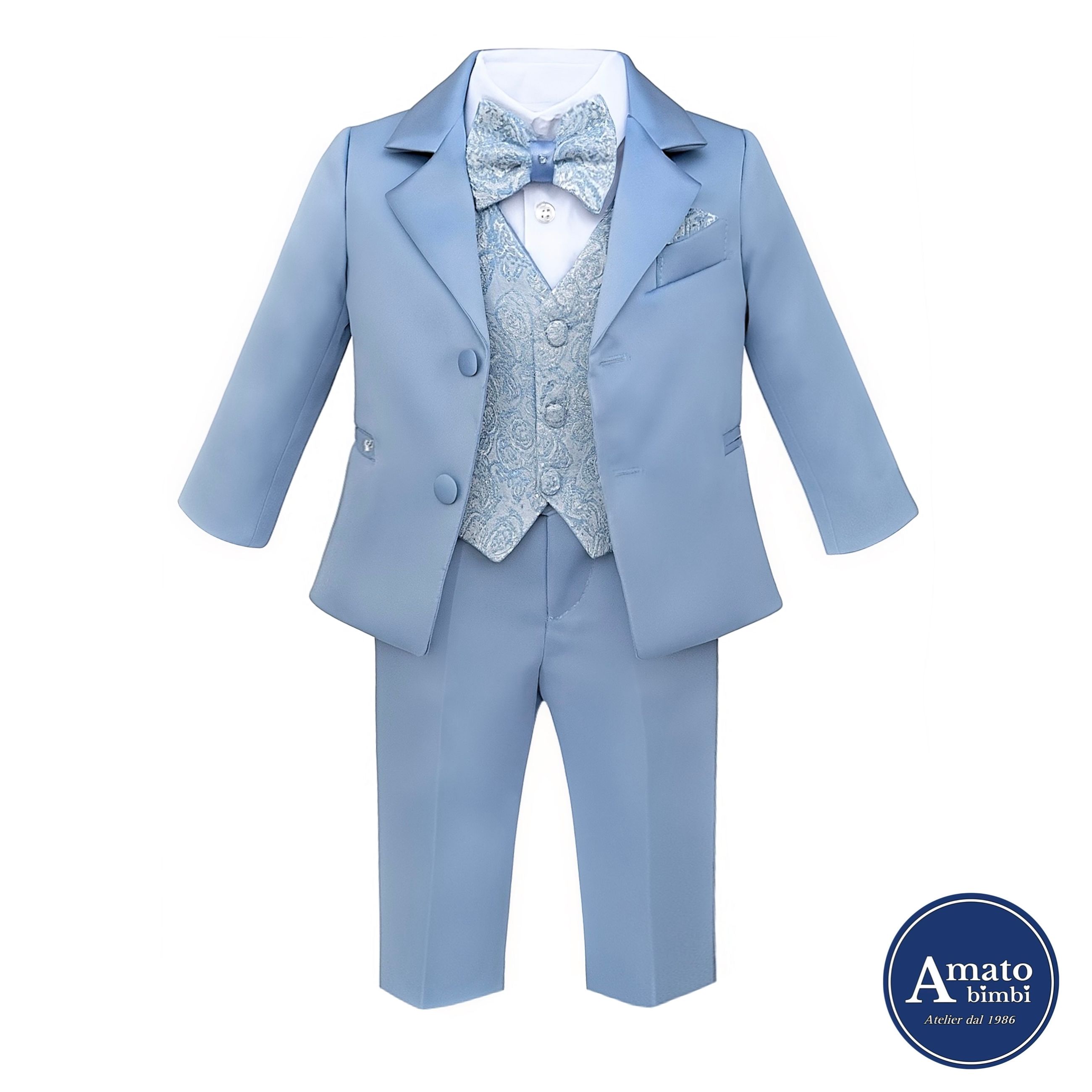 Completo 5 pezzi, con gilet e papillon damascati. Made in Italy rifinito nei minimi dettagli.