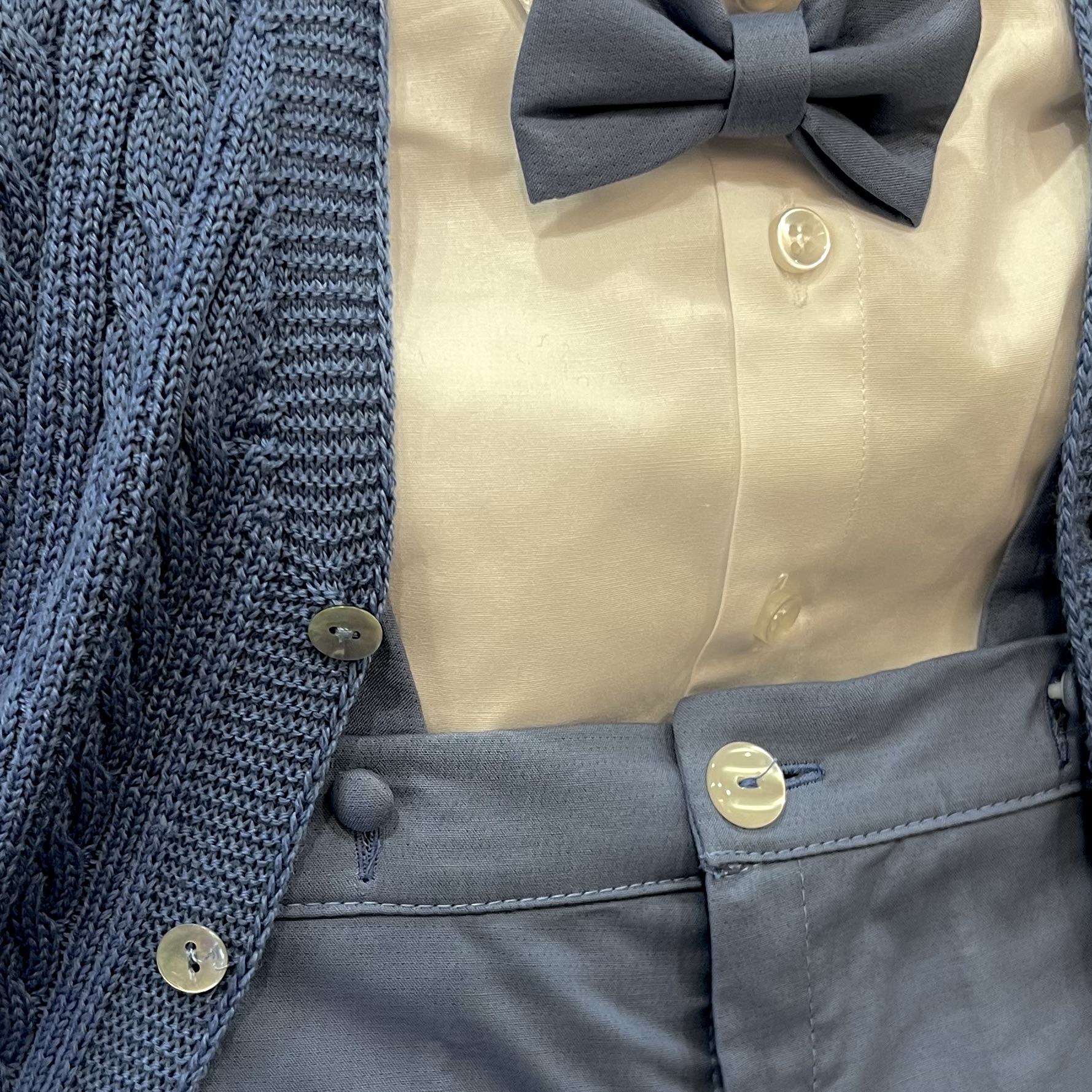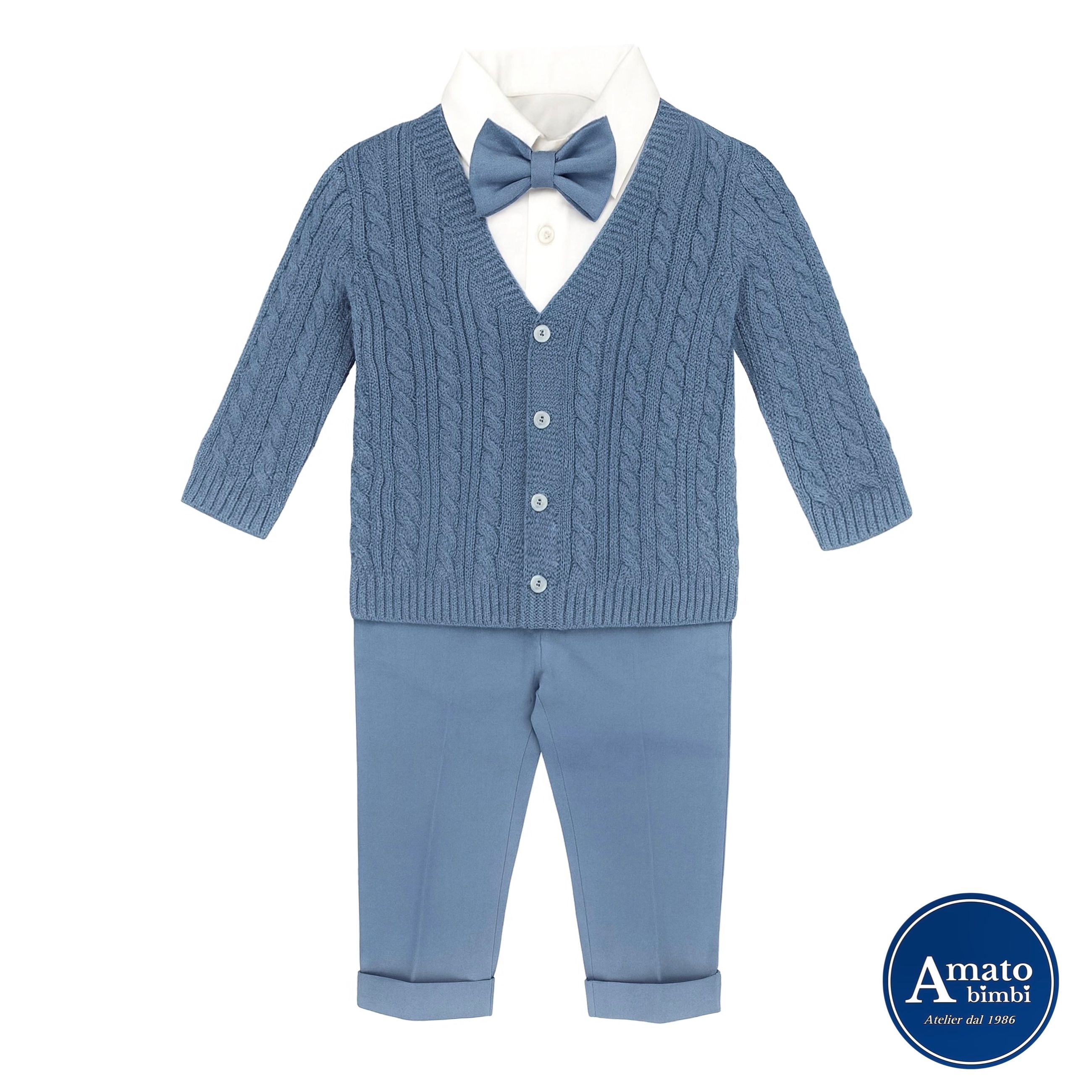 Completo 4 pezzi, giacca in pura lana color avion, pantalone con bretelle e papillon color carta da zucchero, camicia. Made in Italy, rifinito nei minimi dettagli.