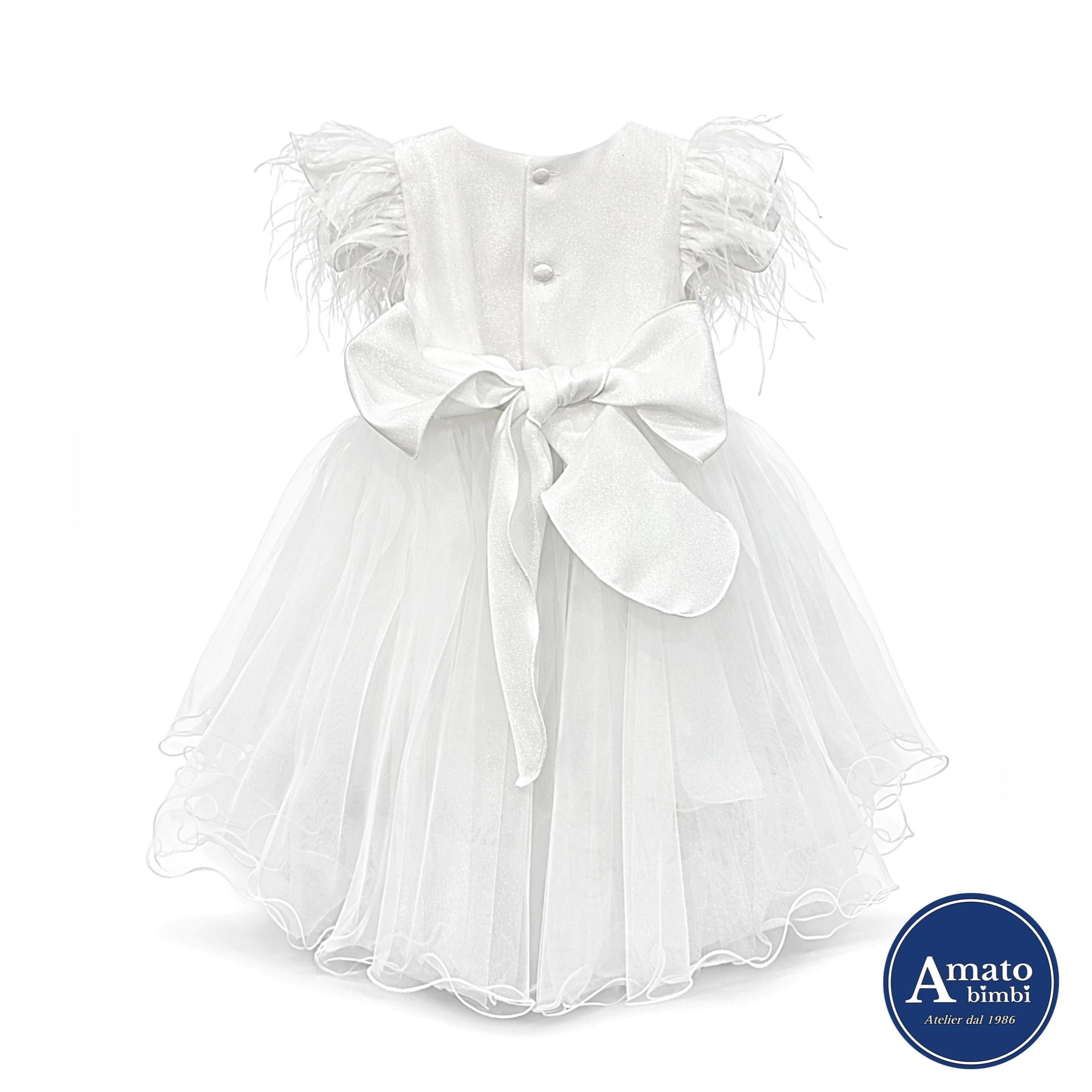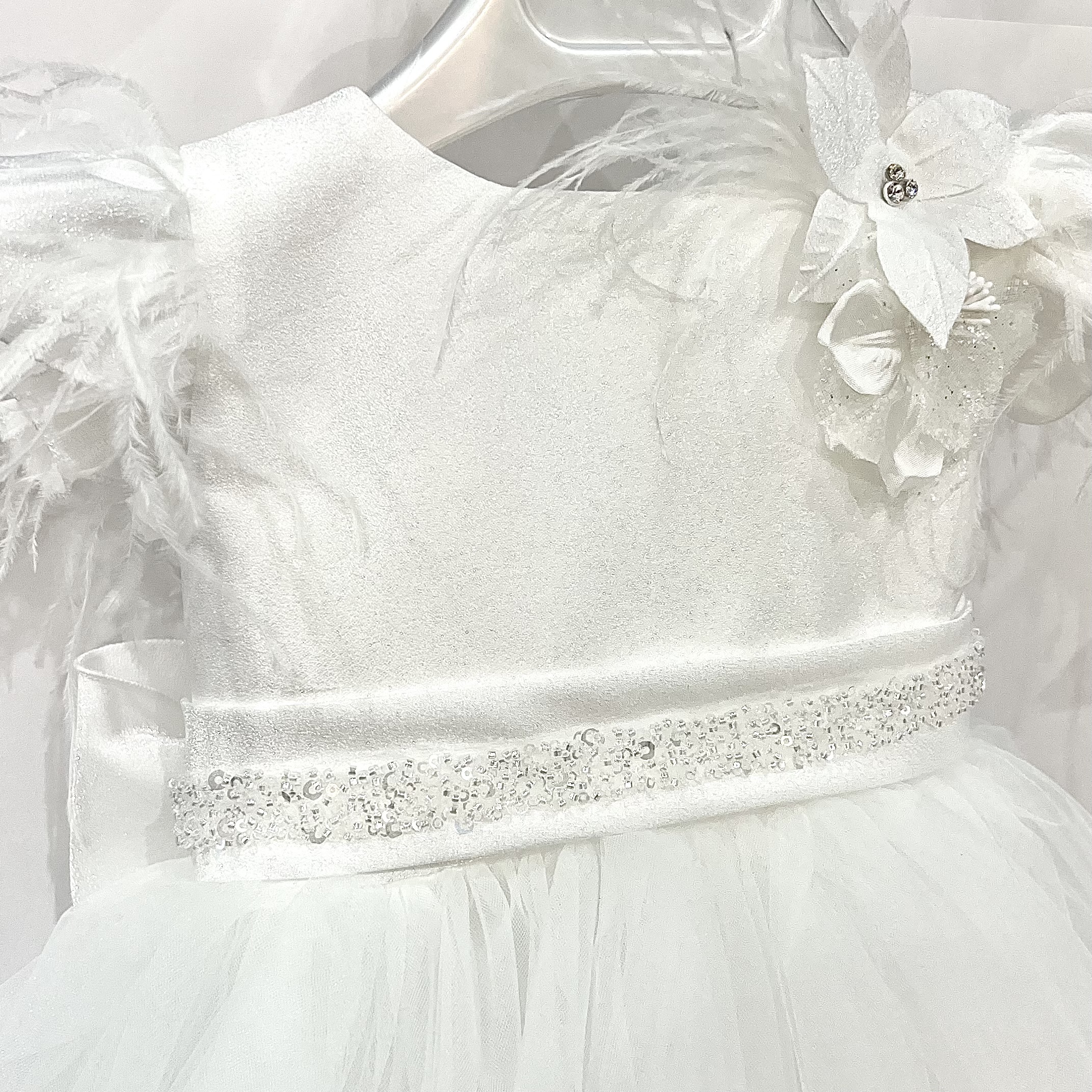 Le maniche corte sono impreziosite da volant in tulle con dettagli in piume, che donano movimento e un tocco sofisticato. Sul punto spalla è presente una grande applicazione floreale, arricchita da piccoli dettagli luminosi, che diventa protagonista del design.