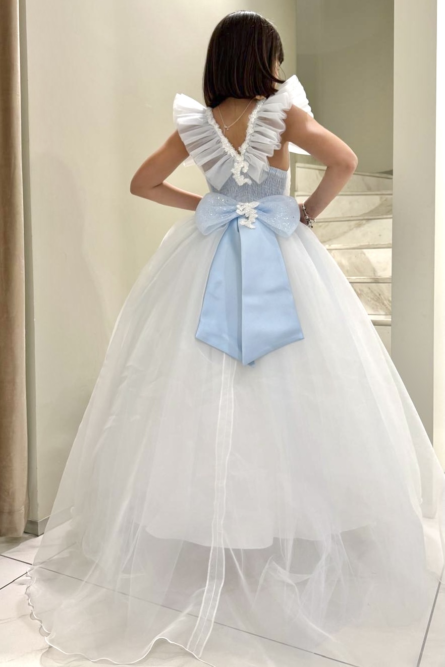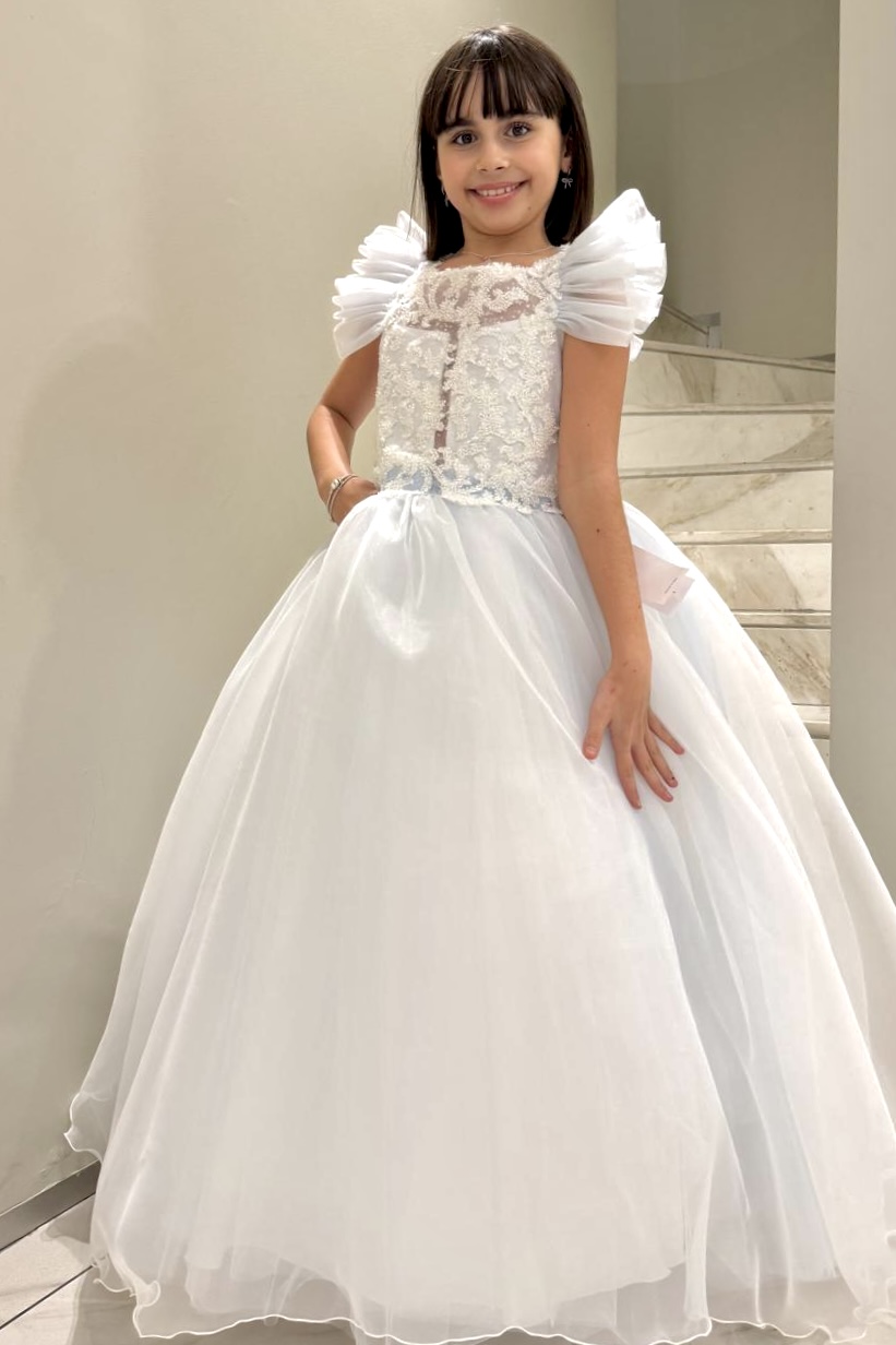 Modello sartoriale caratterizzato da un corpino ricamato con delicati motivi floreali e raffinata lavorazione artigianale. Il corpino è impreziosito da maniche con volant in organza, che donano volume e leggerezza al design.