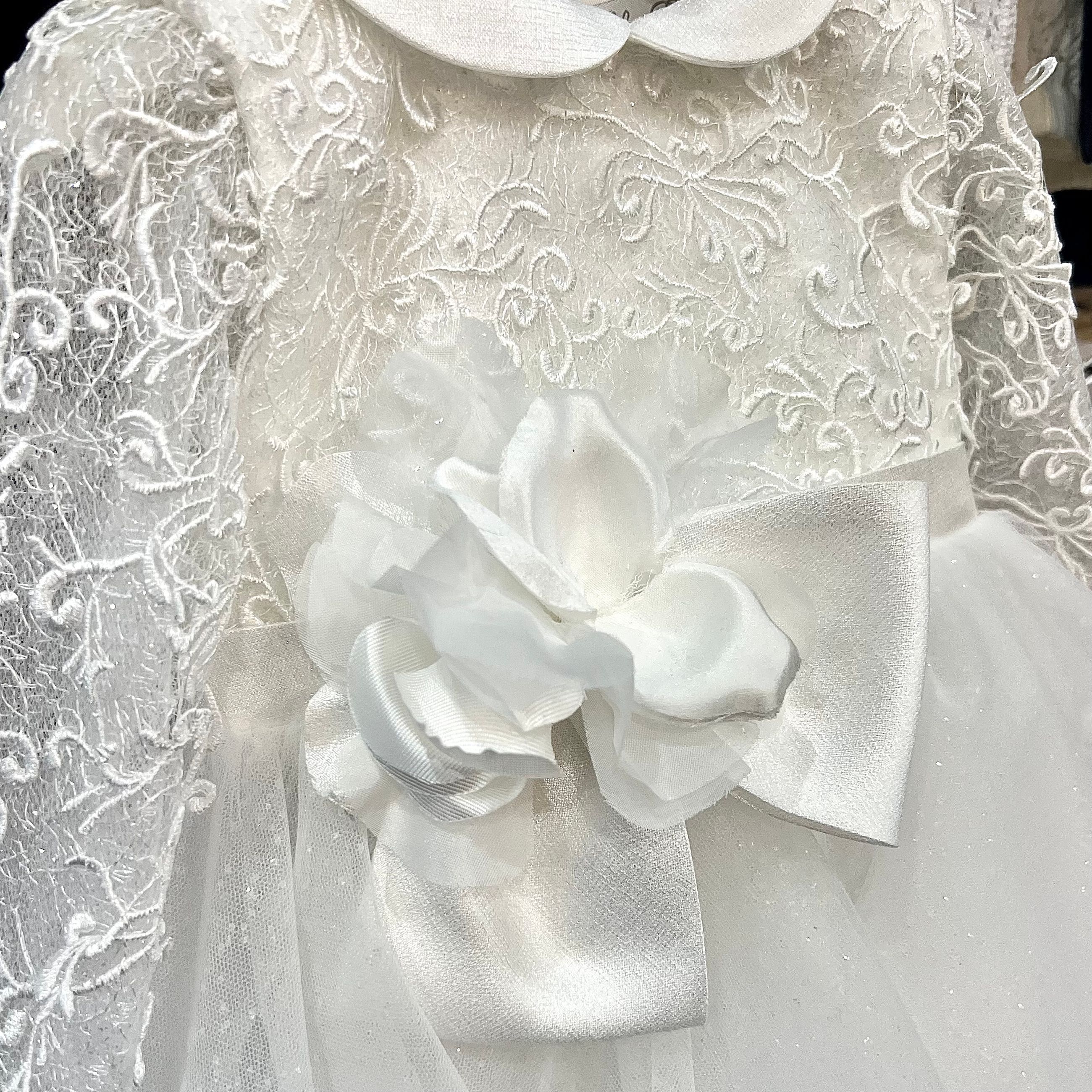 Abito con gonna in tulle e sottogonna in tulle brillantinato, corpino e maniche in pizzo, fiocco rimovibile, color bianco seta. Made in Italy, rifinito nei minimi dettagli.