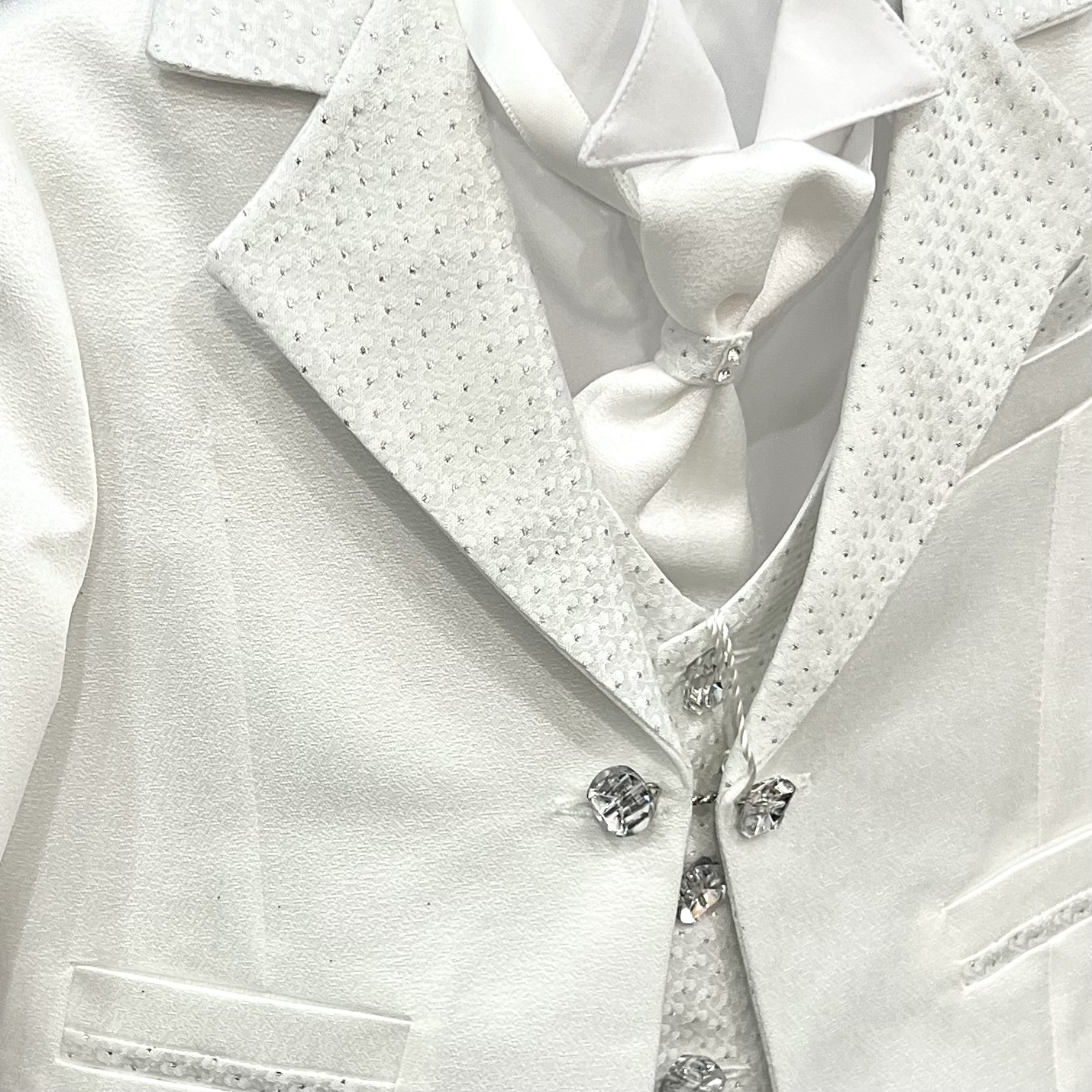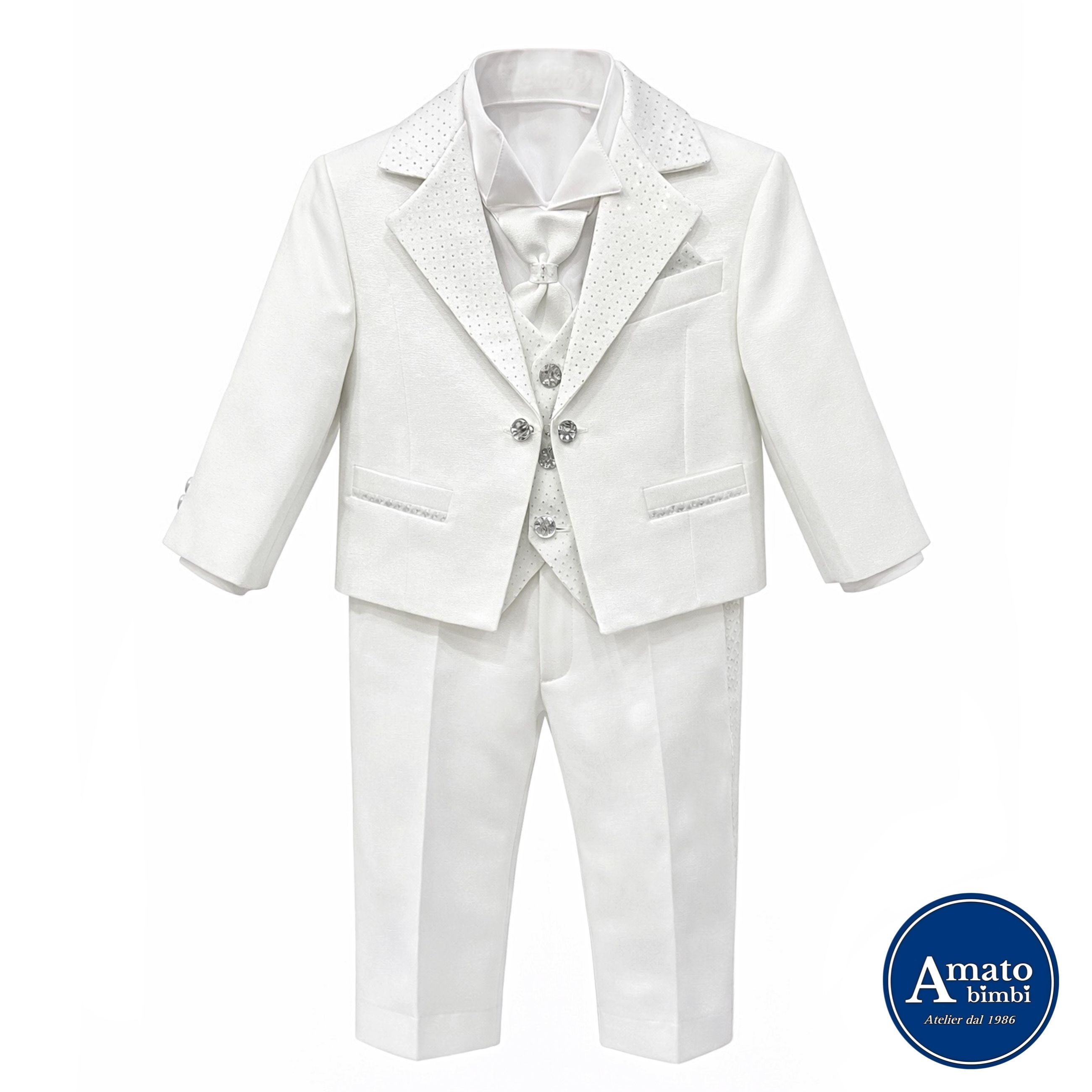 Completo 5 pezzi, giacca, gilet con punti luce, cravatte, camicia e pantalone, color bianco. Made in Italy, rifinito nei minimi dettagli.