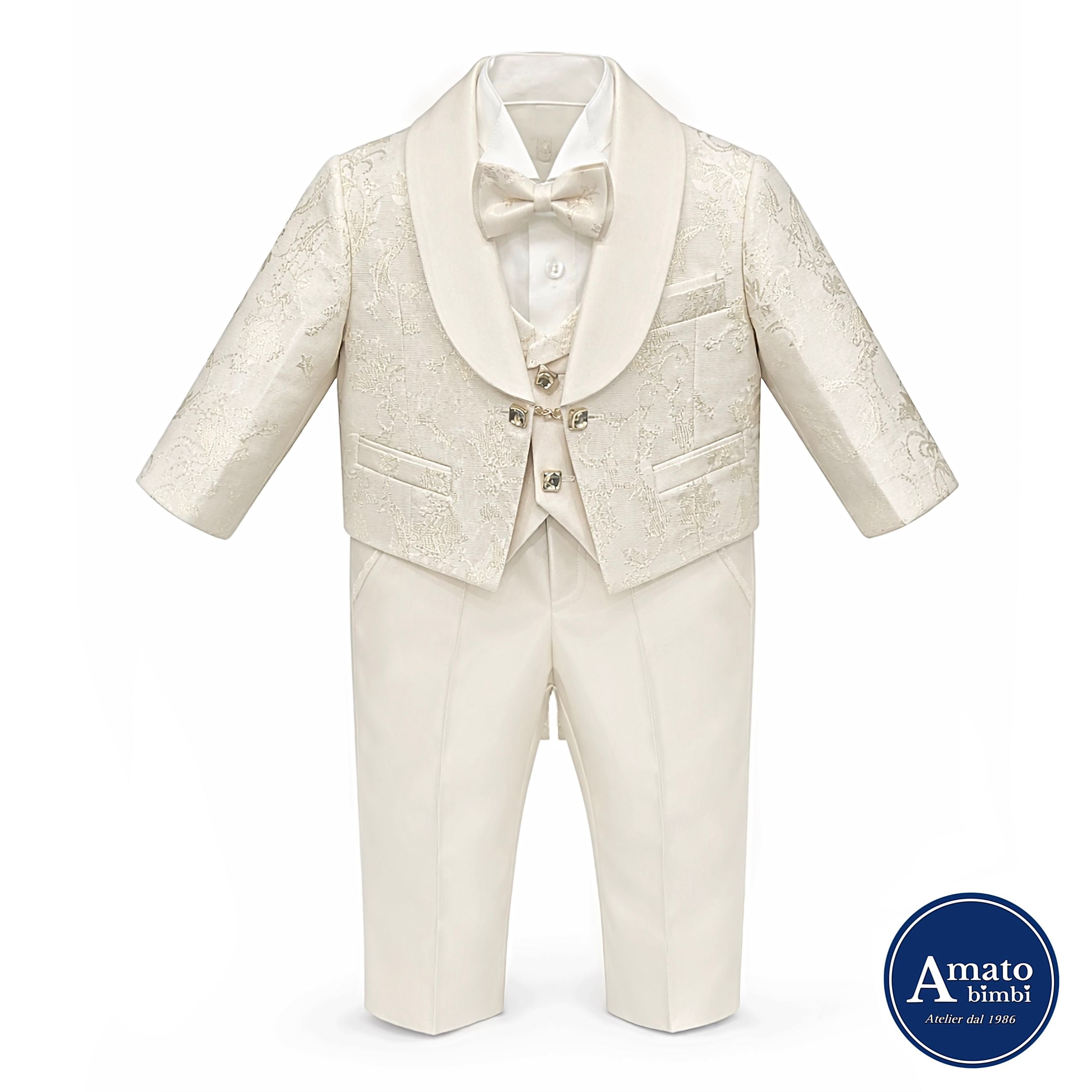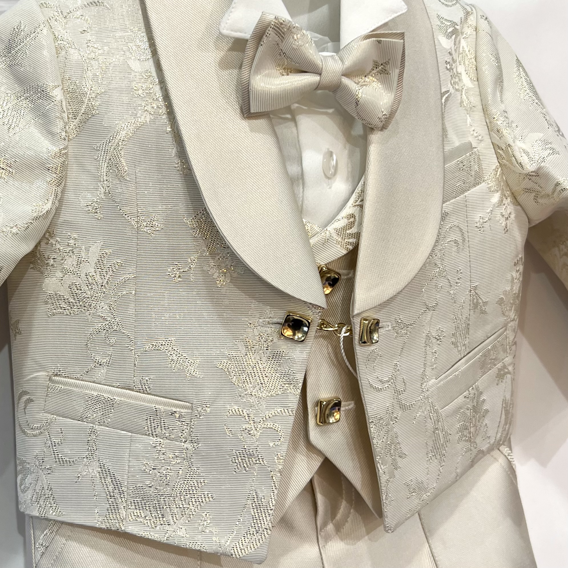 Il gilet coordinato riprende le stesse finiture eleganti ed è abbinato a camicia bianca classica con papillon in tinta panna, per un look armonioso e ben proporzionato.
