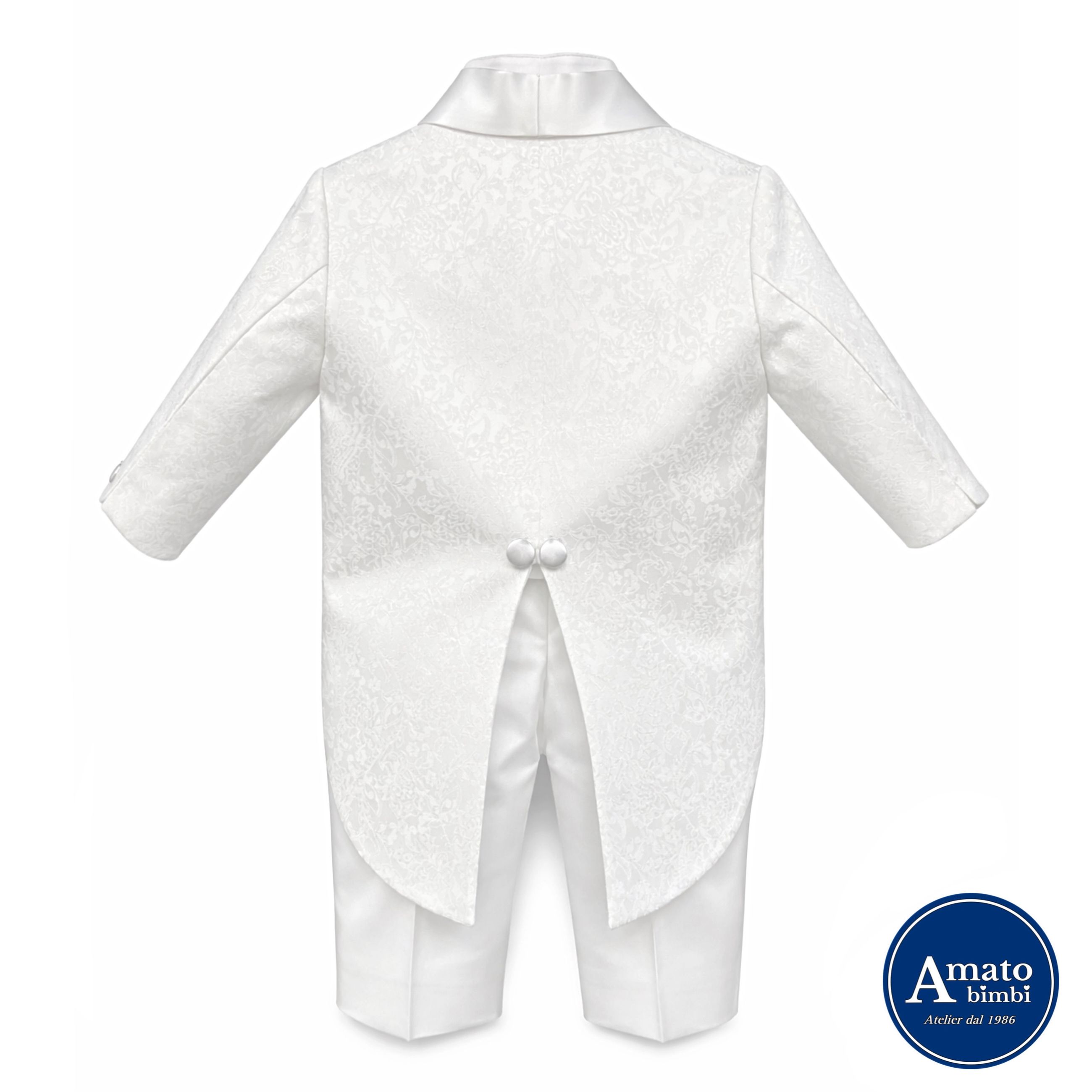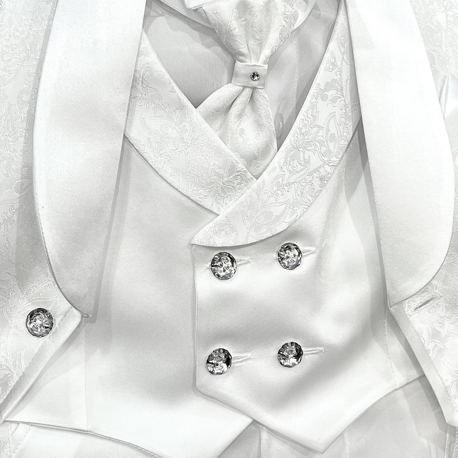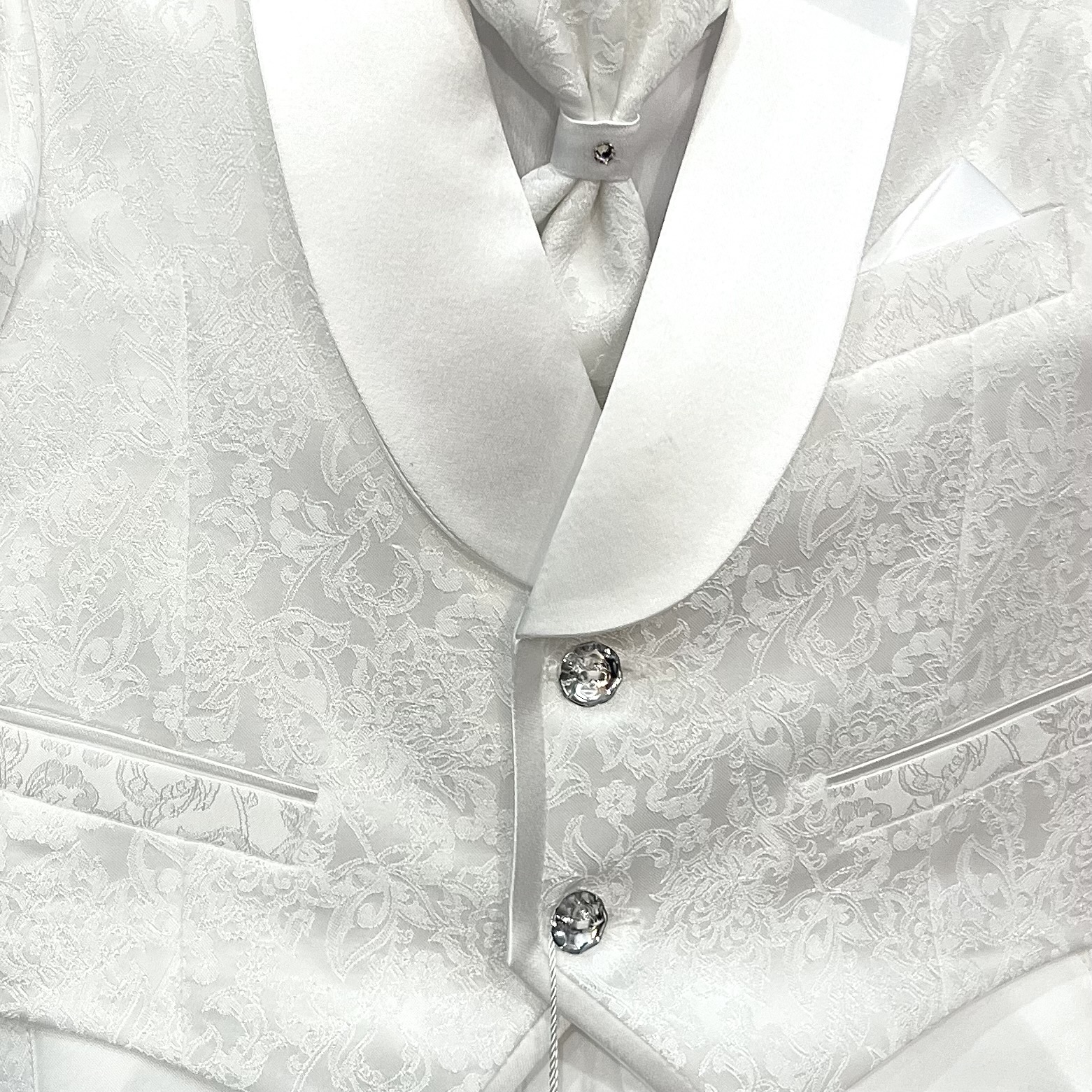 Giacca in mikado damascato con collo sciallato, camicia, gilet, cravattone damascato e pantalone color bianco.