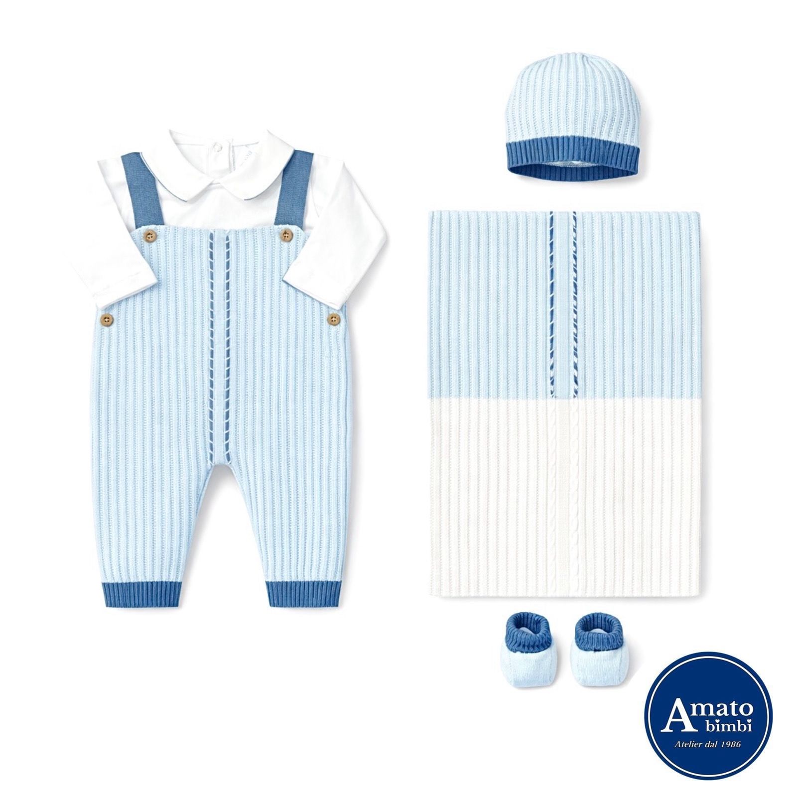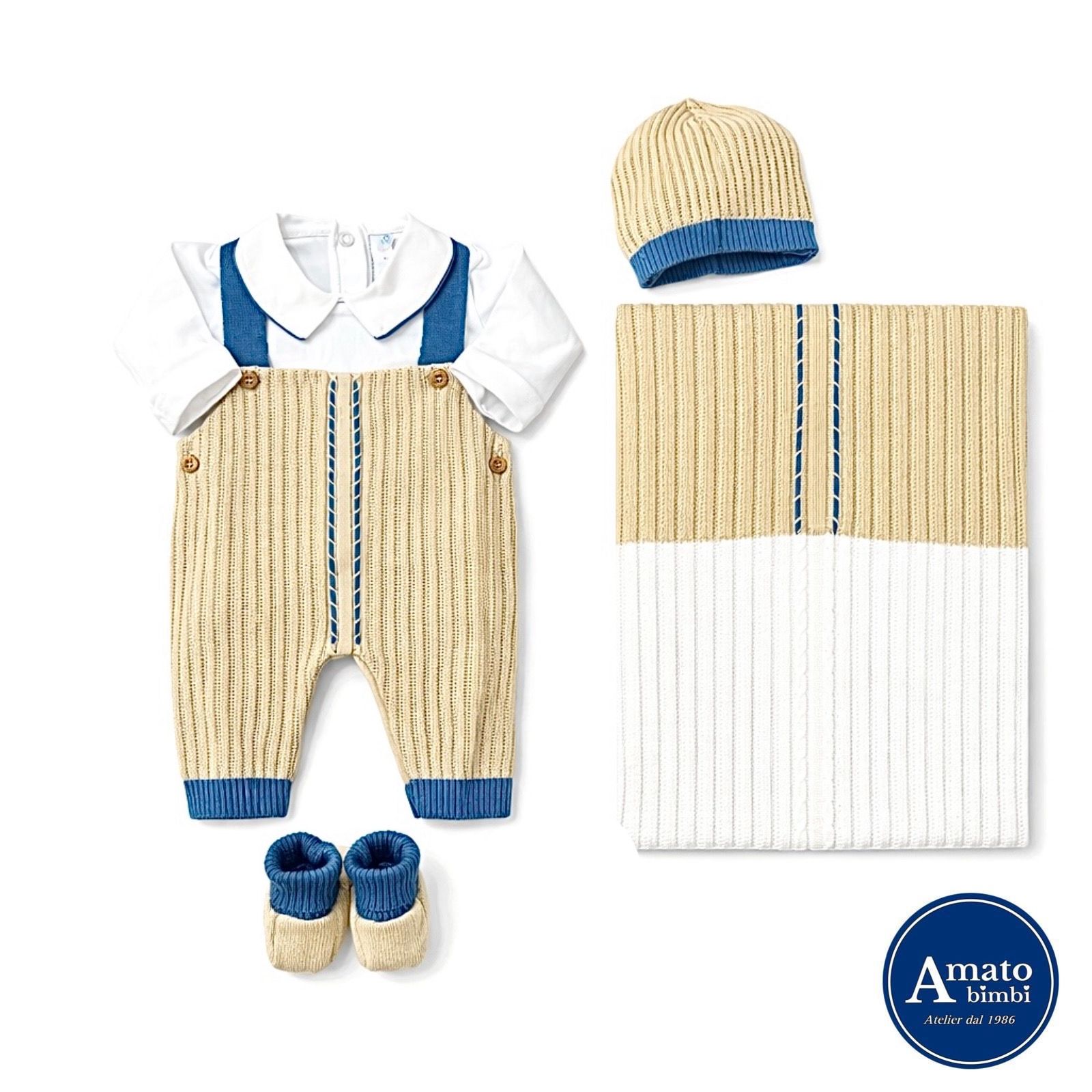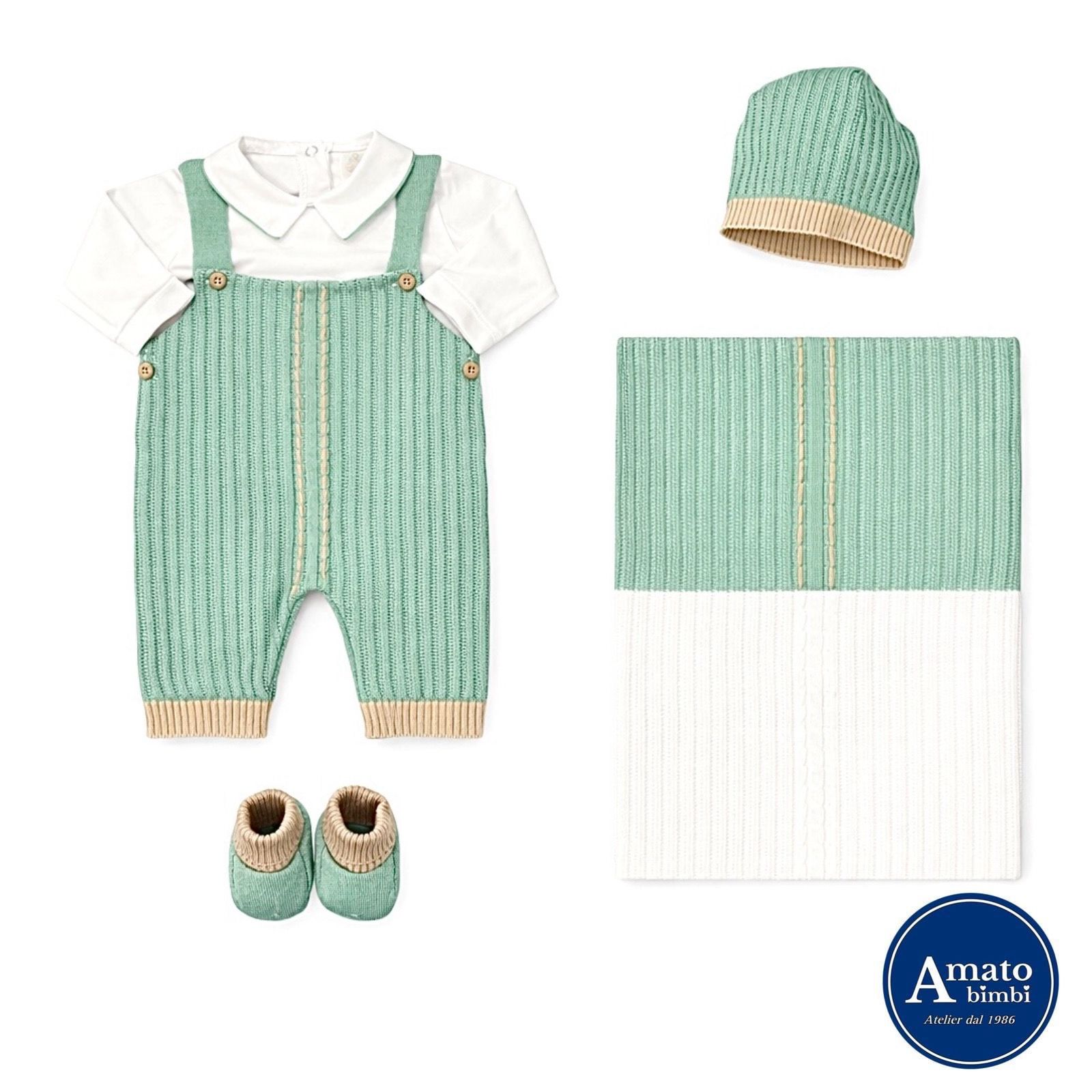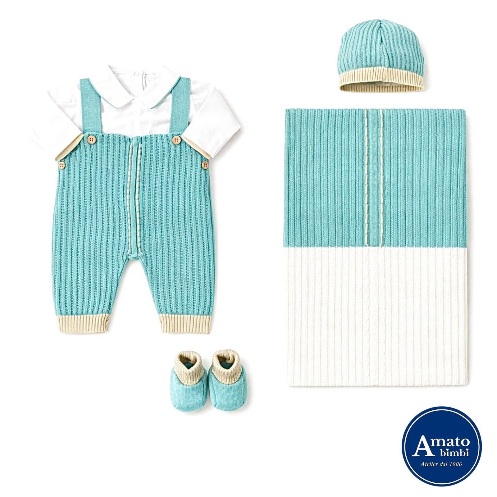 Coordinato in filo. Tutina, copertina, cappellino e scarpette. Made in Italy, rifinito nei minimi dettagli.