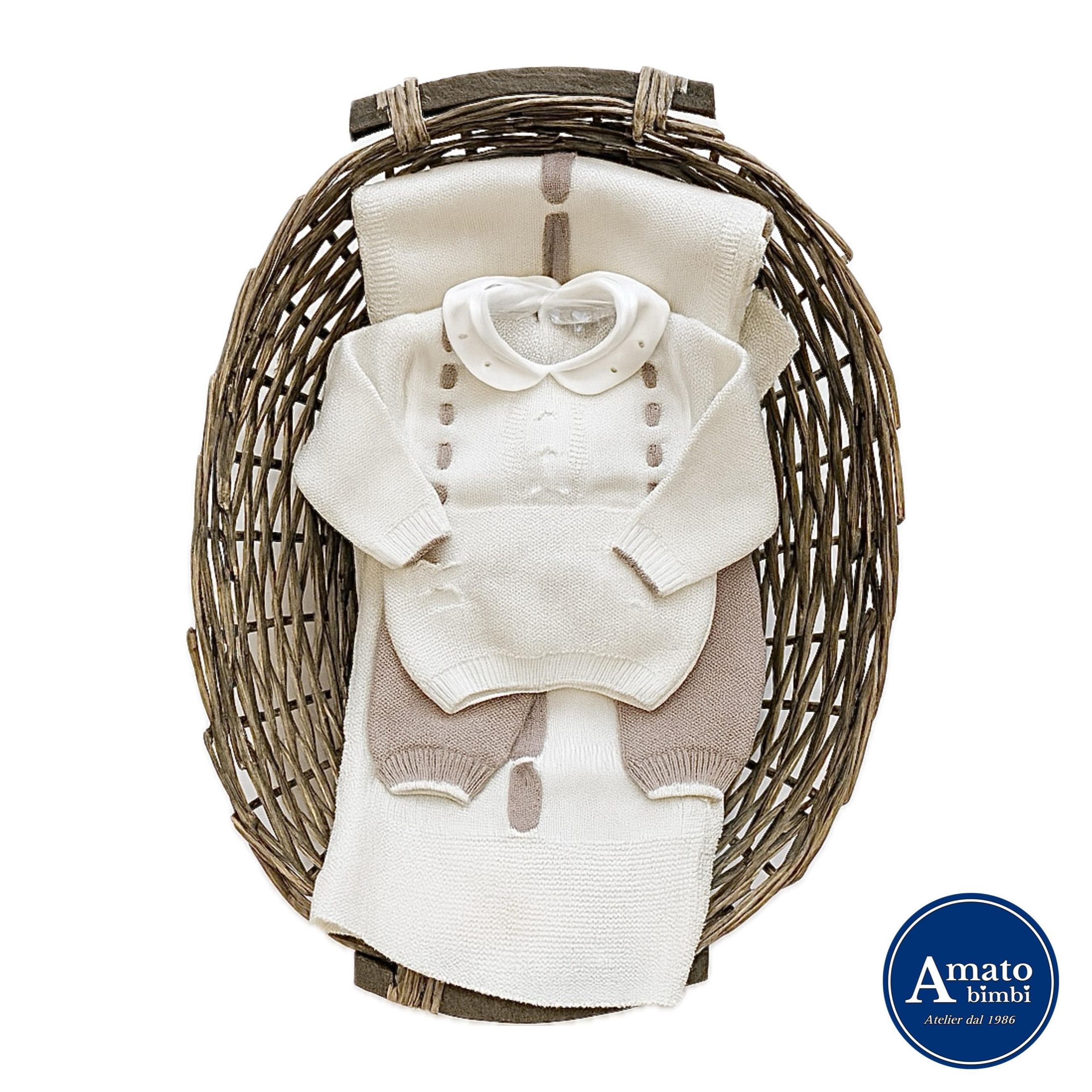Coordinato nascita in pregiata pura lana vergine. Completino 2 pezzi e copertina, color panna e tortora. Made in Italy.