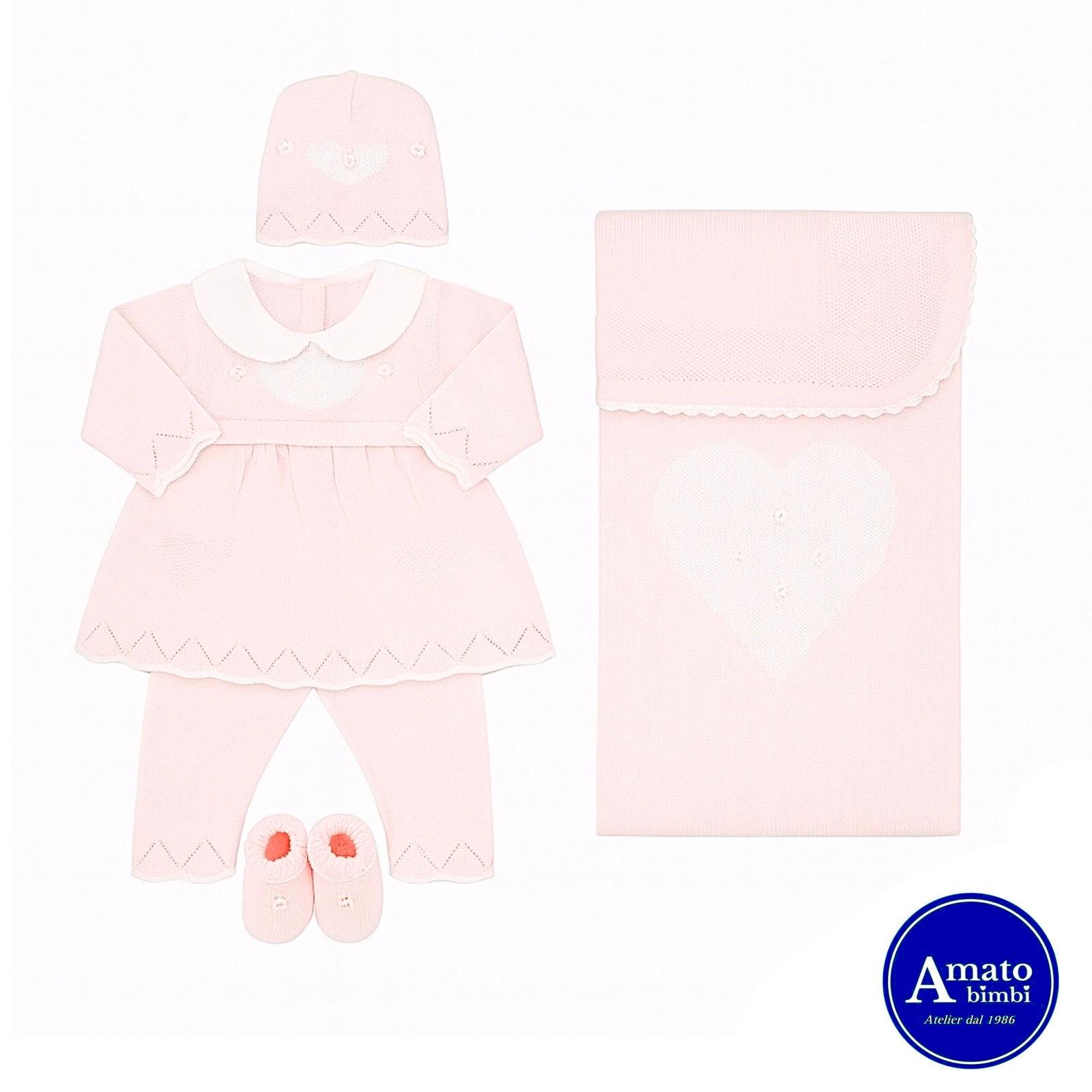 Coordinato in filo. Completino 2 pezzi, copertina, cappellino e scarpette, color rosa e bianco. Made in Italy, rifinito nei minimi dettagli.