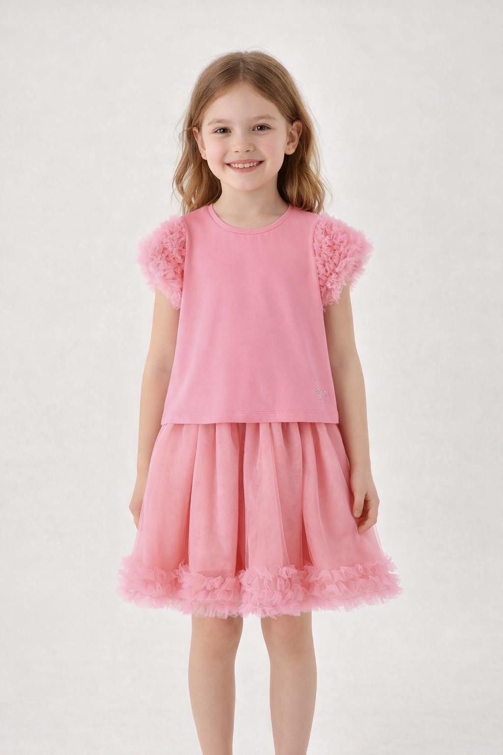 Completo per bambina Sarabanda. T-shirt in jersey stretch di cotone con inserti in tulle. Gonna in tulle con fodera in cotone